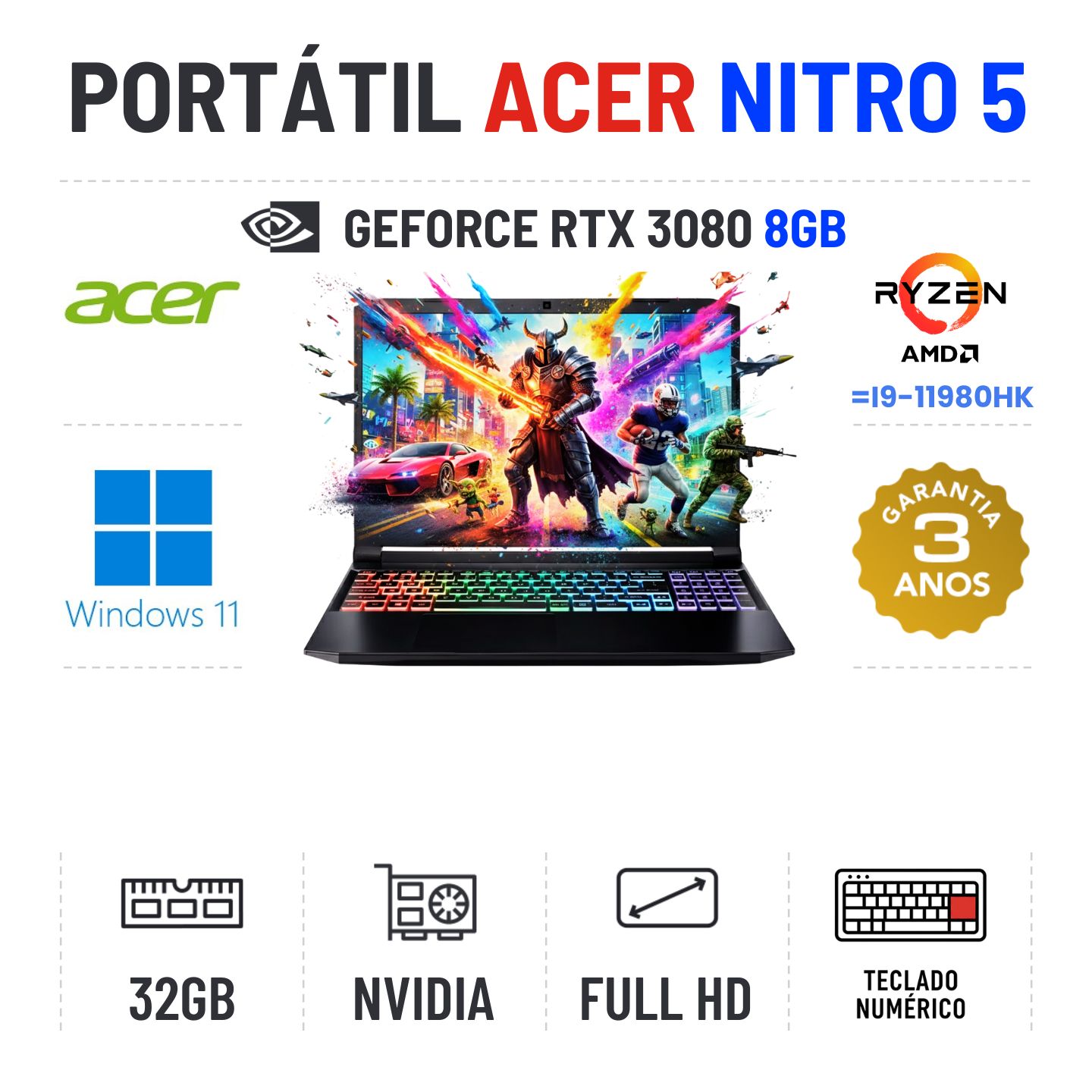ACER NITRO 5 AN515-45-R5JZ | 15.6'' FULLHD IPS 360Hz | RYZEN 9 = I9-11980HK | 32GB RAM | 960GB SSD | RTX3080 8GB | TECLADO NUMÉRICO