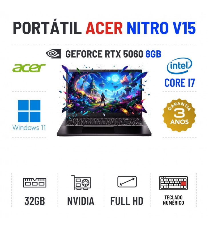 ACER NITRO V15 | 15.6'' FULLHD 180Hz | I7-13620H | 32GB RAM | 960GB SSD | RTX5060 8GB | TECLADO NUMÉRICO