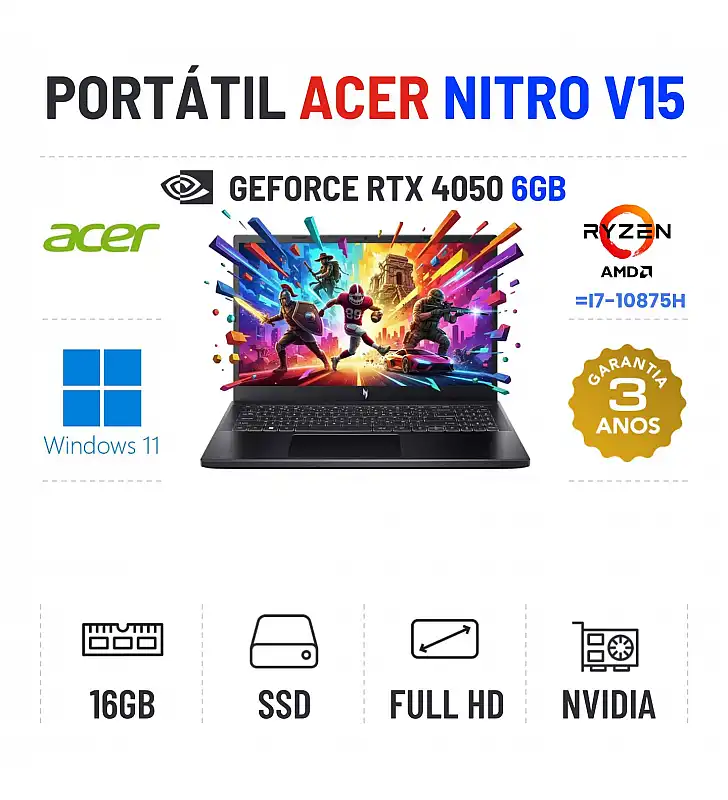 Joga a toda a velocidade com o portátil gaming Acer Nitro V15 ANV15-41, que integra um processador AMD RYZEN 5 7535HS, GPU GeForce RTX™ 4050 um ecrã LCD FHD de 15,6" 165 Hz (1920 x 1080).