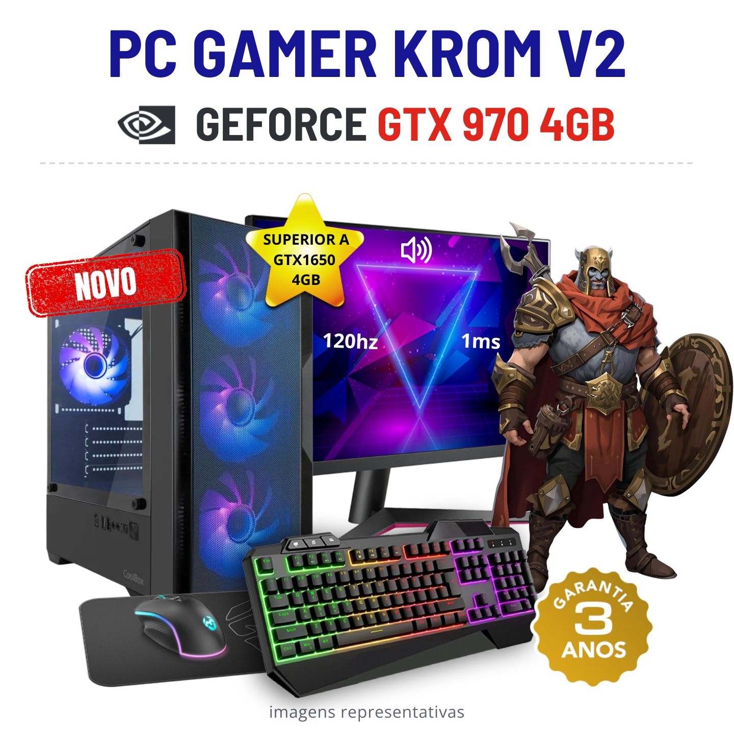 CONJUNTO GAMER KROM V2 | GTX970-4GB SUPERIOR A GTX1650-4GB | RYZEN 3 = i7-7700K | 16GB RAM | 480GB SSD COM MONITOR + ACESSORIOSNovo com 3 Anos de Garantia