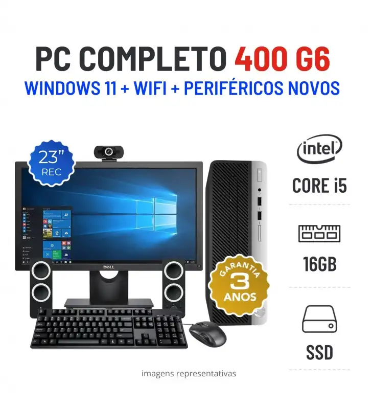 CONJUNTO HP PRODESK 400 G6 SFF | i5-8400 | 16GB RAM | 480GB SSD COM MONITOR + ACESSORIOSEstado Grau A. Funciona como Novo. Recondicionado sem qualquer tipo de danos. Somente com ligeiros indicios de uso