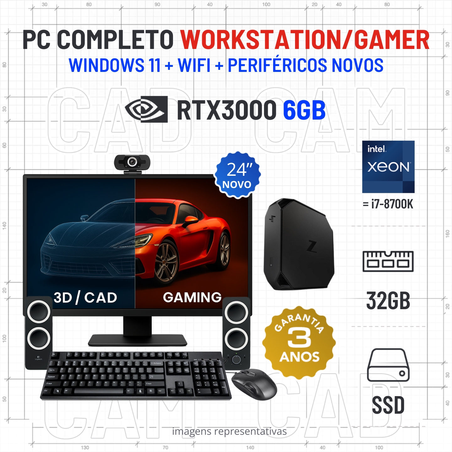 CONJUNTO WORKSTATION/GAMER HP Z2 G5 MICRO/MINI | XEON=i7-8700K | 32GB RAM | 960GB SSD | RTX3000-6GB=RTX3050-6GB COM MONITOR + ACESSORIOS
