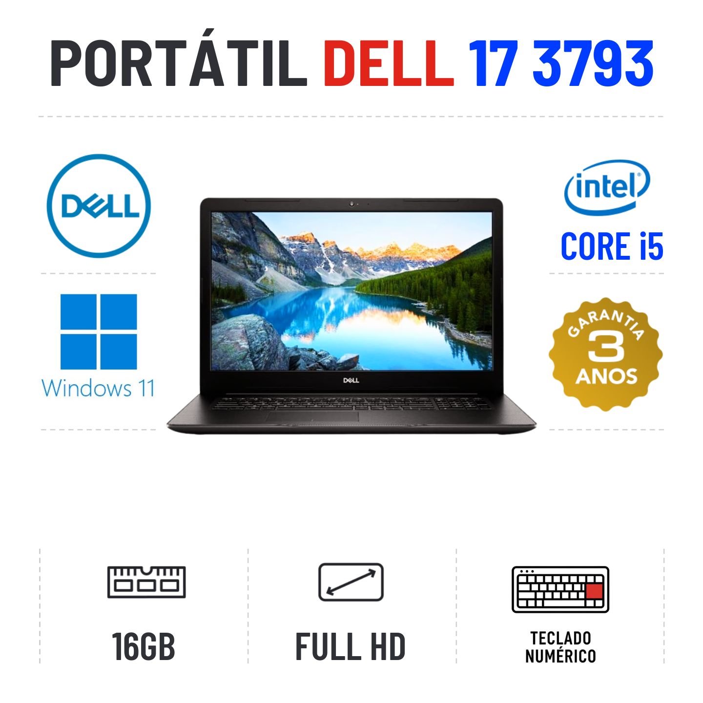 DELL INSPIRON 17 3793 | 17" FULLHD | i5-1035G1 | 16GB RAM | 480GB SSD | TECLADO NUMÉRICOEstado Grau A. Sem qualquer tipo de danos. Somente com ligeiros indicios de uso
