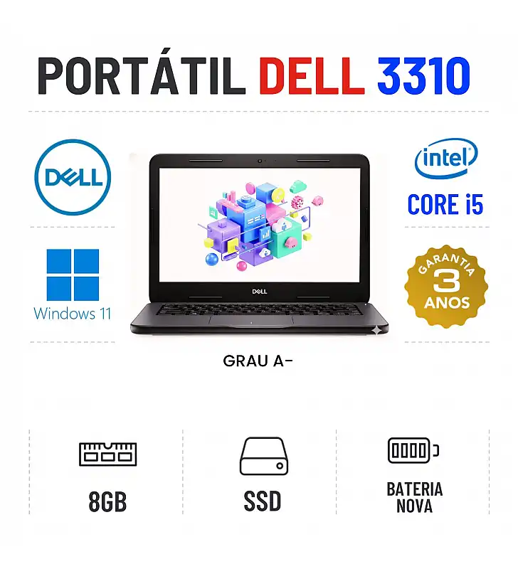 DELL LATITUDE 3310 | 13.3'' | i5-8265u | 8GB RAM | 240GB SSD | BATERIA NOVAGrau A menos - Funciona como Novo. Apontamentos estéticos ligeiros. Preço comparado com novo