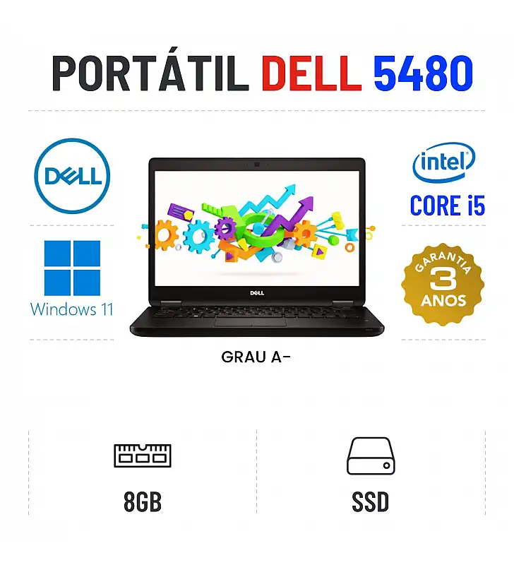 DELL LATITUDE 5480 | 14.1" | i5-7200U | 8GB RAM | SSDGrau A menos - Funciona como Novo. Apontamentos estéticos ligeiros. Preço comparado com novo