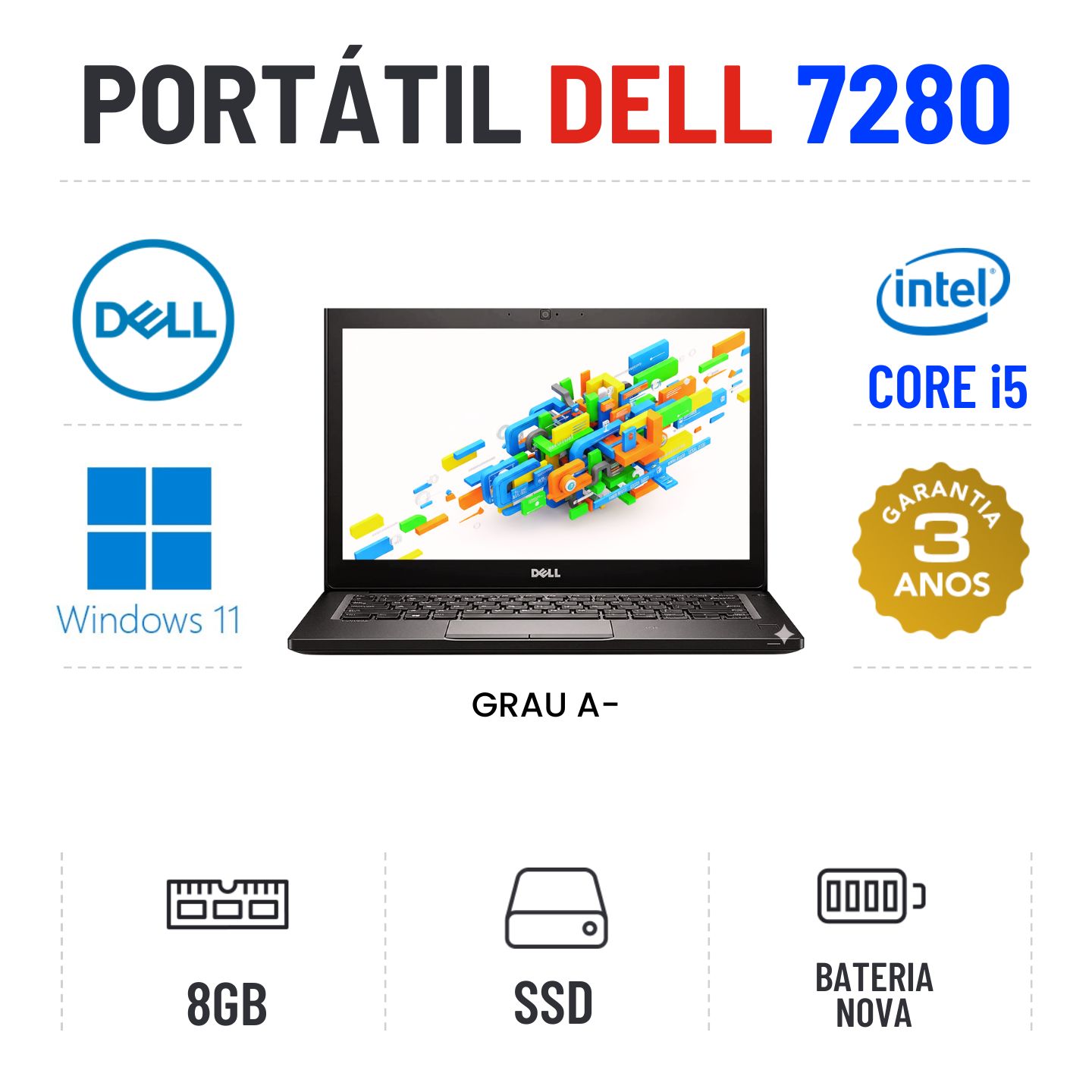 DELL LATITUDE 7280 | 12.5" | i5-7200u | 8GB RAM | 240GB SSD | BATERIA NOVAGrau A menos - Apontamentos estéticos ligeiros - 100% funcional