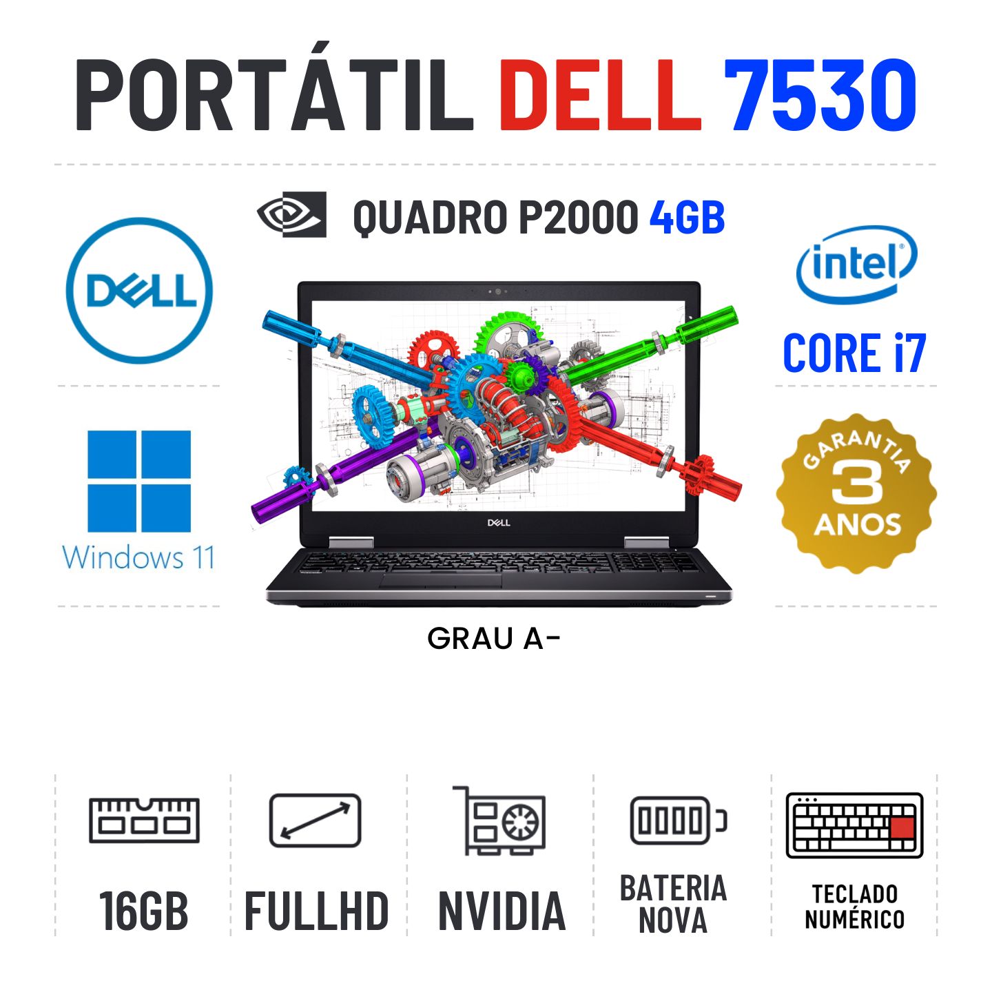 DELL PRECISION 7530 | 15.6" FULLHD | I7-8850H | 16GB RAM | 240GB SSD | QUADRO P2000 4GB | BATERIA NOVA | TECLADO NUMERICOGrau A menos - Apontamentos estéticos ligeiros - 100% funcional