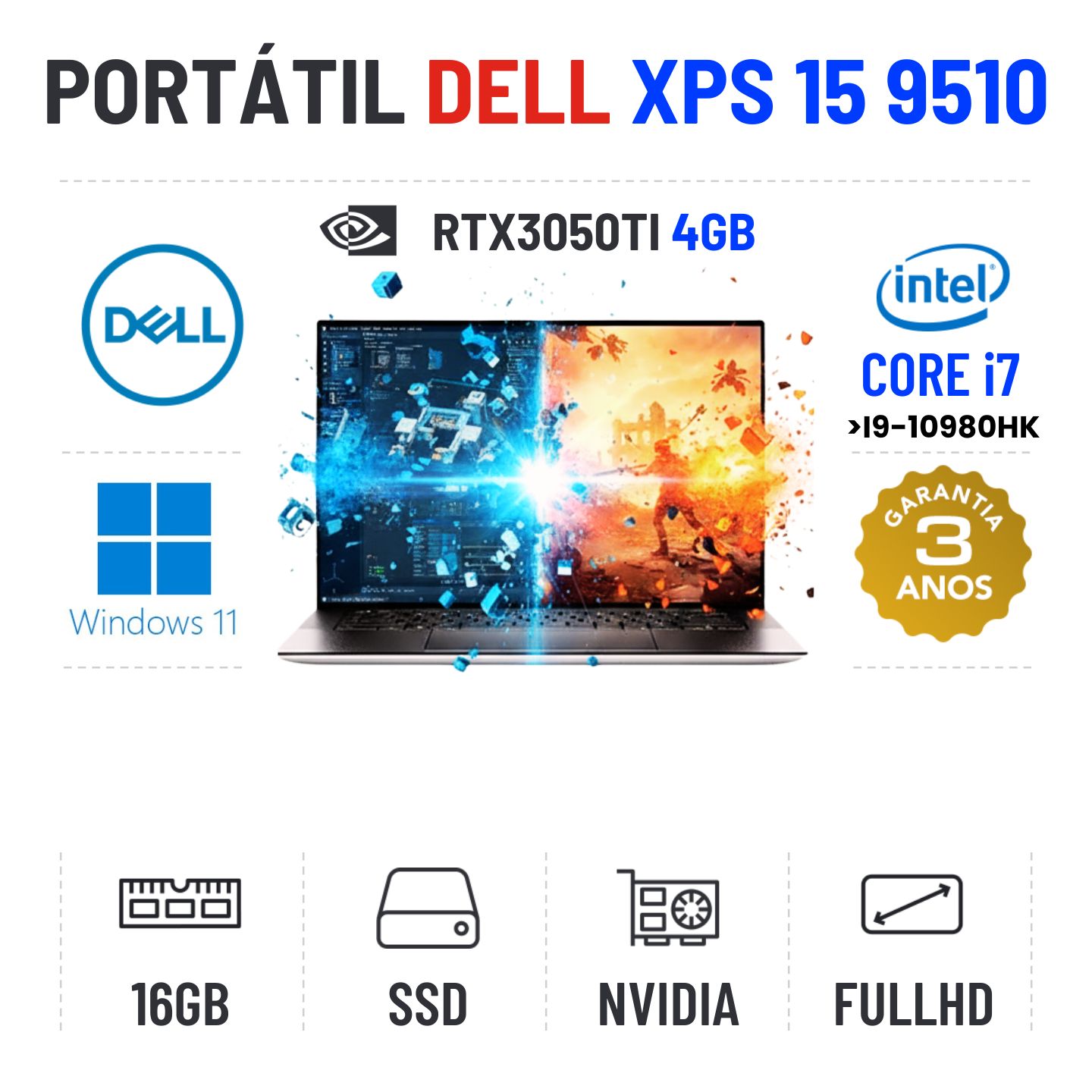 DELL XPS 15 9510 | 15.6" FULLHD | i7-11800H SUPERIOR A I9-10980HK | 16GB RAM | 480GB SSD | RTX3050TI-4GBEstado Grau A. Sem qualquer tipo de danos. Somente com ligeiros indicios de uso
