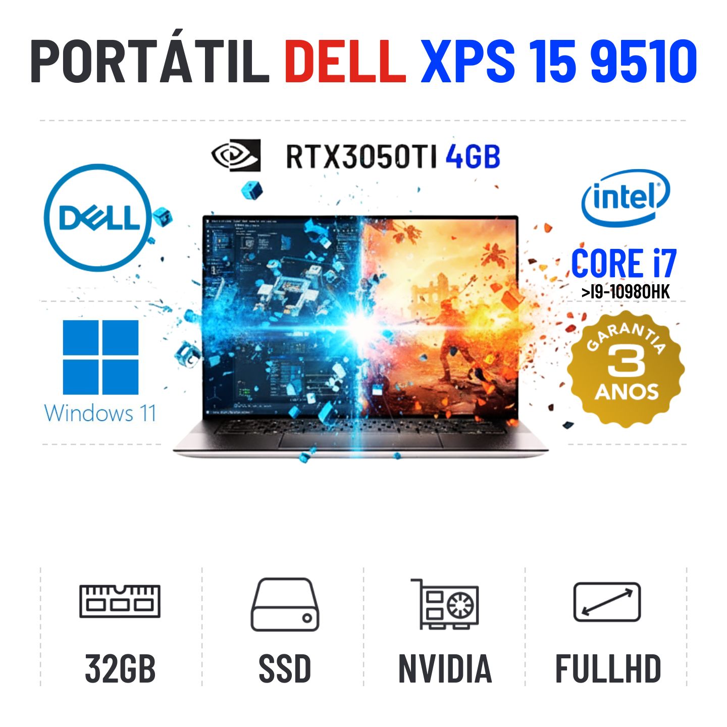DELL XPS 15 9510 | 15.6" FULLHD | i7-11800H SUPERIOR A I9-10980HK | 32GB RAM | 960GB SSD | RTX3050TI-4GB | OFERTA OFFICEEstado Grau A. Sem qualquer tipo de danos. Somente com ligeiros indicios de uso