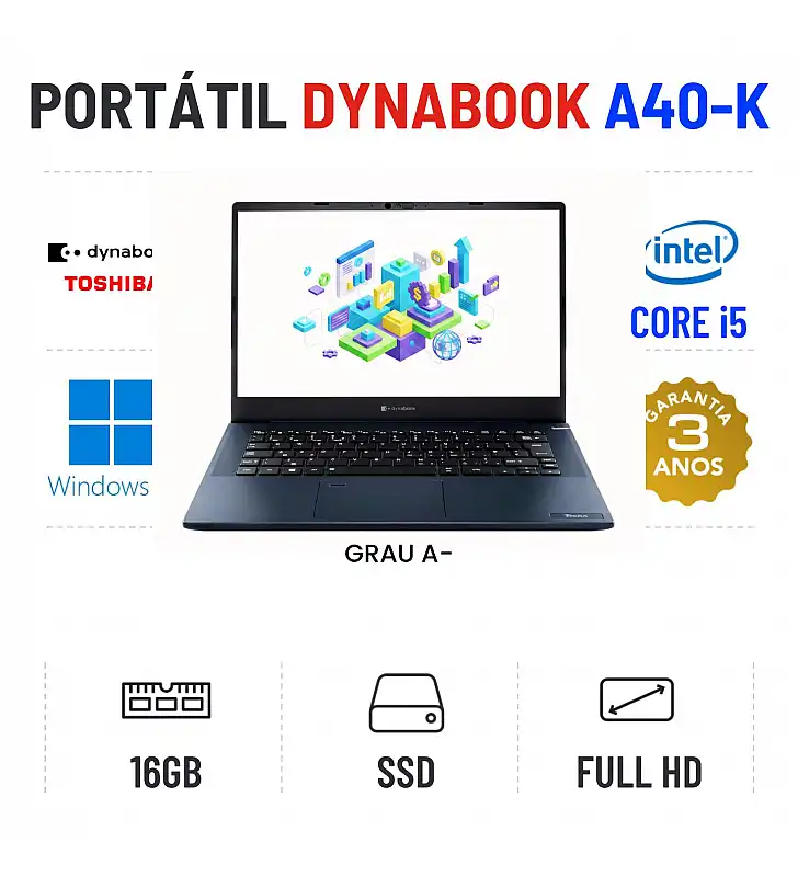 DYNABOOK TECRA A40-K | 14" FULLHD | I5-1240P | 16GB RAM | 240GB SSDGrau A menos - Funciona como Novo. Apontamentos estéticos ligeiros. Preço comparado com novo