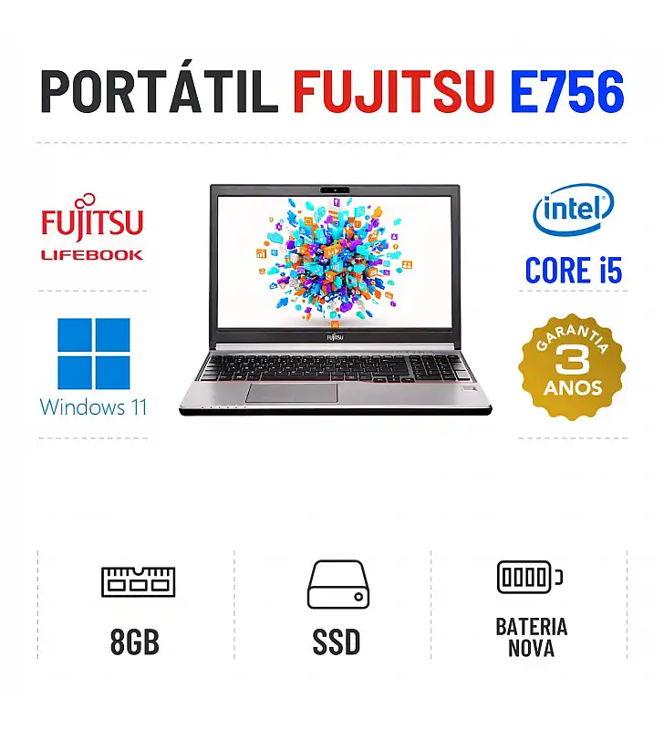 FUJITSU LIFEBOOK E756 | 15.5" | i5-6300U | 8GB RAM | 240GB SSD | BATERIA NOVAEstado Grau A. Funciona como Novo. Recondicionado sem qualquer tipo de danos. Somente com ligeiros indicios de uso