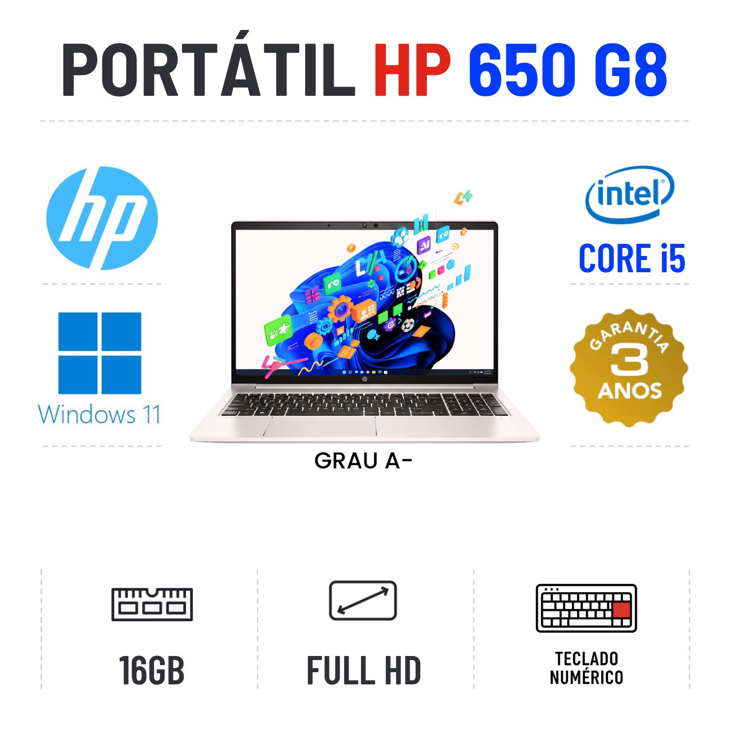 HP PROBOOK 650 G8 | 15.6" FULLHD | i5-1135G7 | 16GB RAM | 240GB SSD | TECLADO NUMÉRICOGrau A menos - Funciona como Novo. Apontamentos estéticos ligeiros. Preço comparado com novo