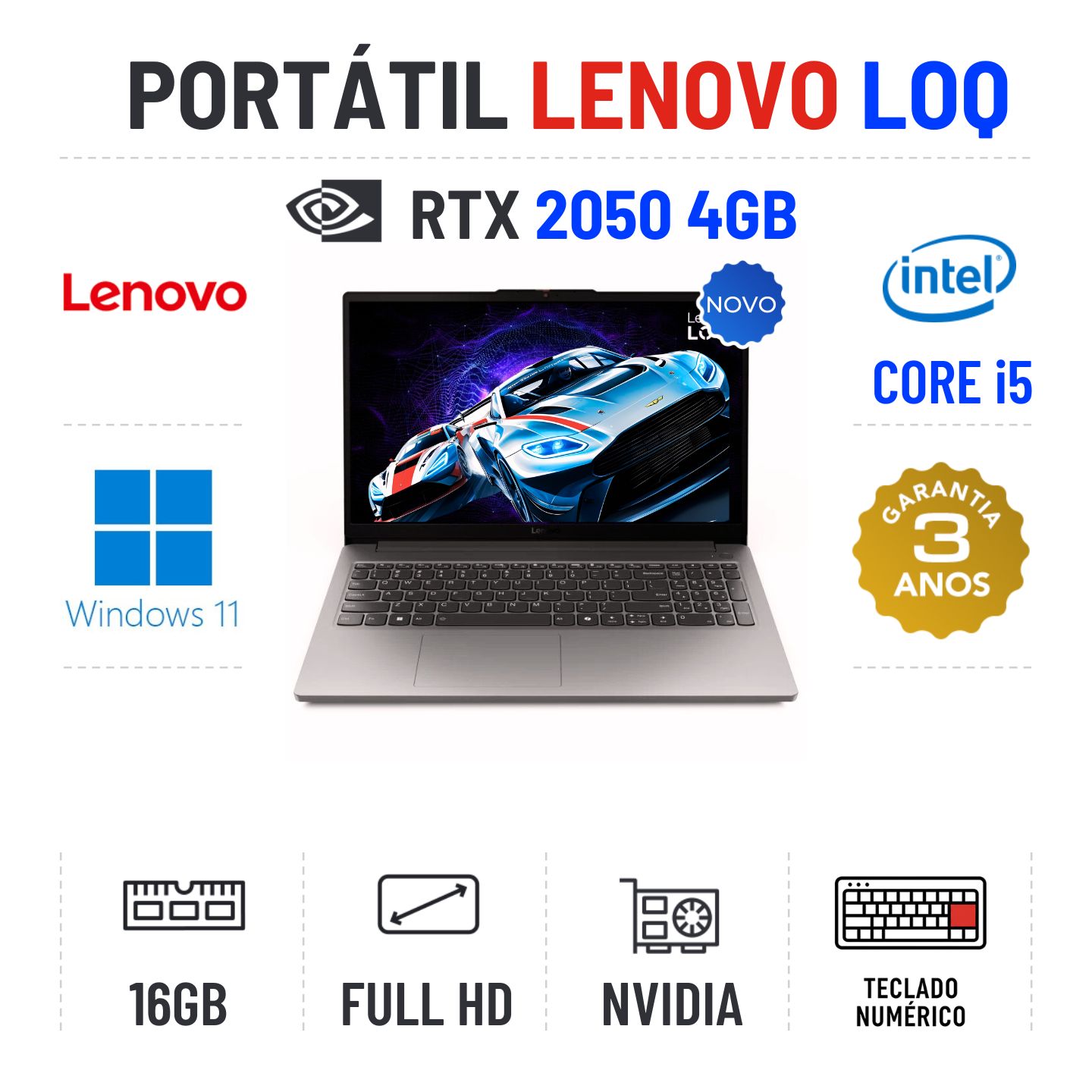 LENOVO LOQ 15 | 15.6'' FULLHD 144HZ | i5-12450HX | 16GB RAM | 480GB SSD | RTX 2050 4GB | TECLADO NUMÉRICONovo com 3 Anos de Garantia