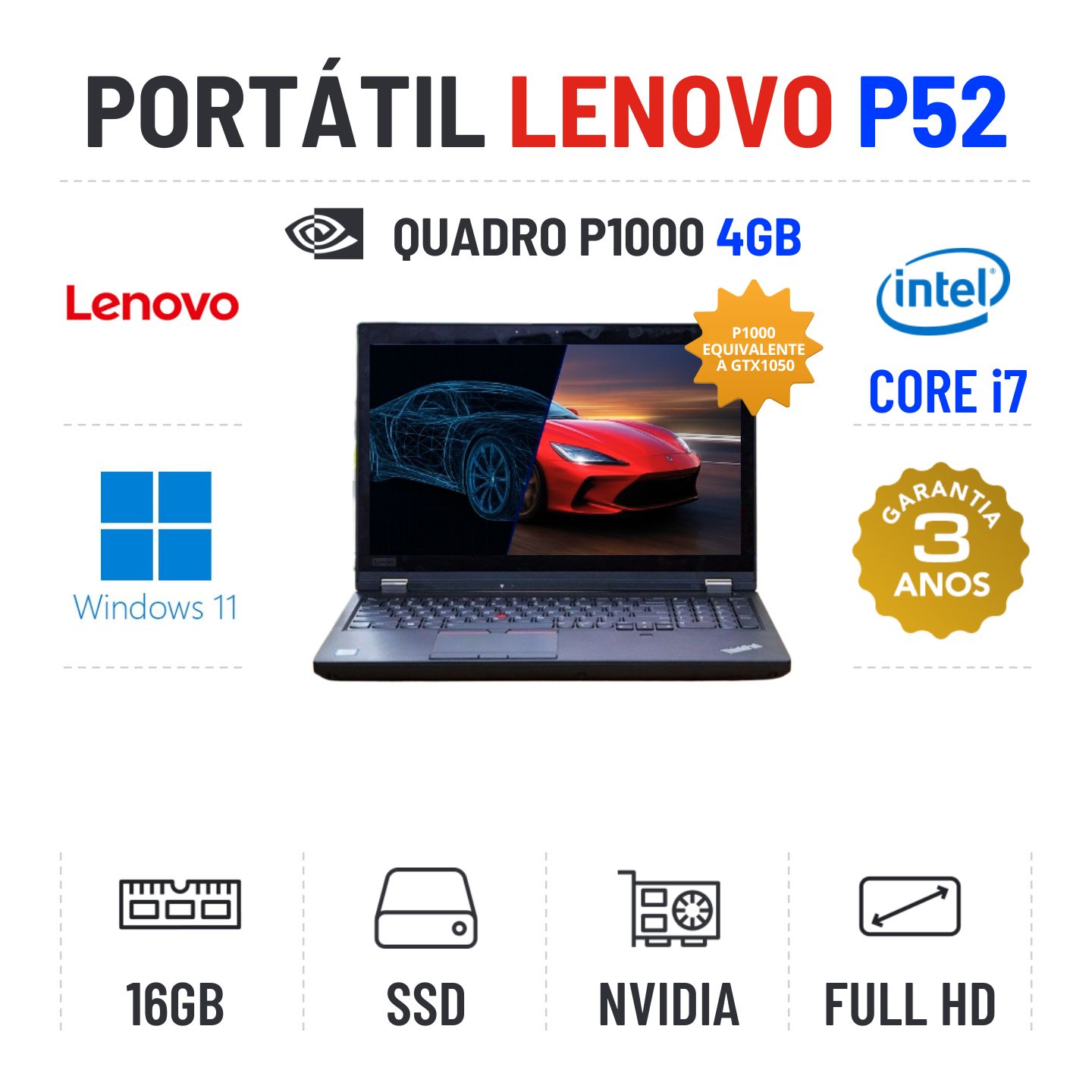 LENOVO P52 | 15.6" FULLHD | i7-8750H | 16GB RAM | 480GB SSD | QUADRO P1000 4GB = GTX1050 | TECLADO NUMERICOEstado Grau A. Sem qualquer tipo de danos. Somente com ligeiros indicios de uso