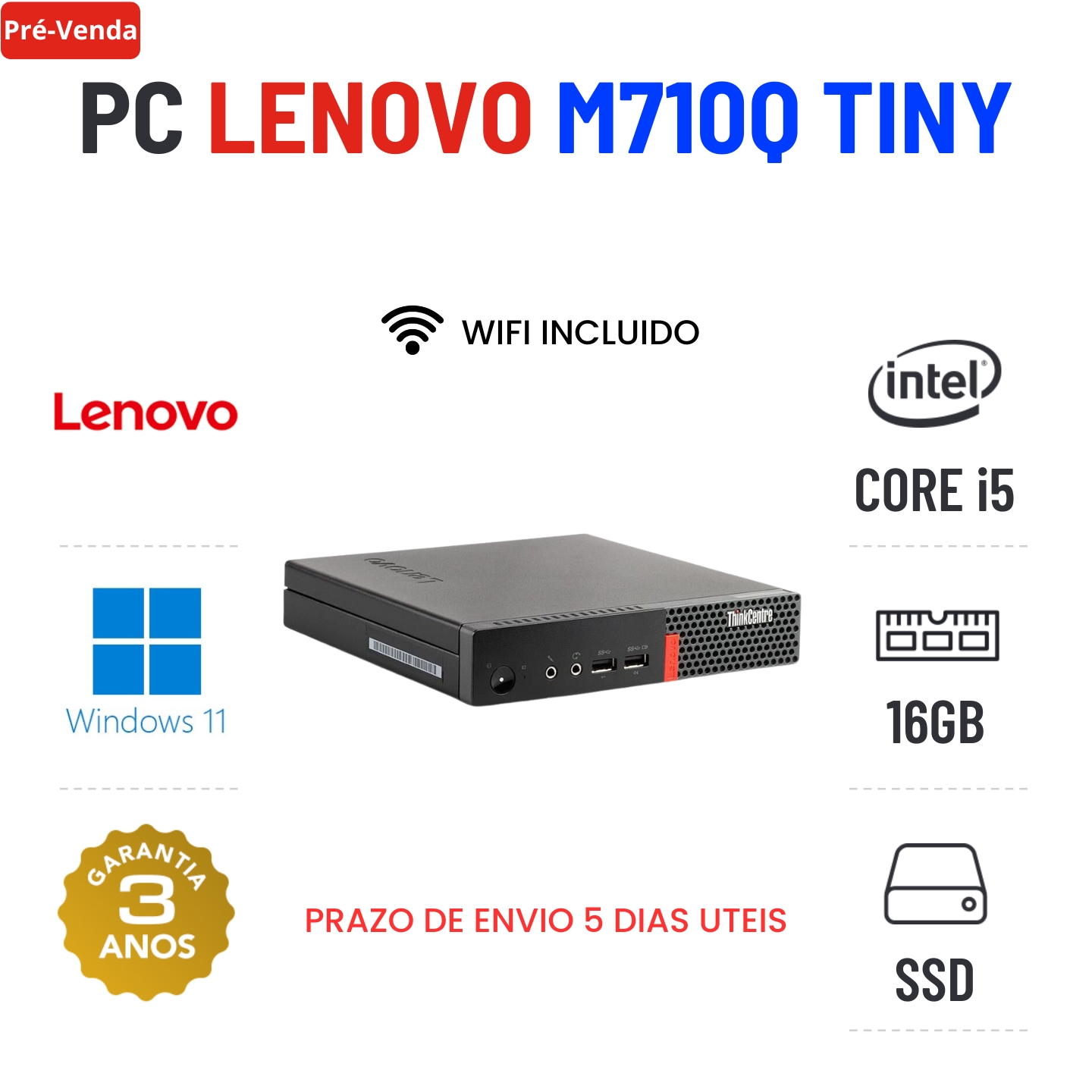 LENOVO THINKCENTRE M710Q MINI | i5-7400T | 16GB RAM | 240GB SSDEstado Grau A. Sem qualquer tipo de danos. Somente com ligeiros indicios de uso