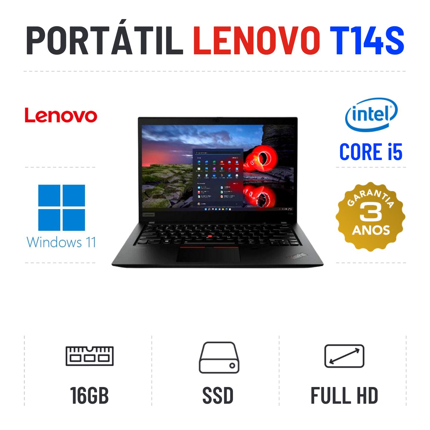 LENOVO THINKPAD T14S | 14" FULLHD | i5-10310U | 16GB RAM | 480GB SSDEstado Grau A. Sem qualquer tipo de danos. Somente com ligeiros indicios de uso