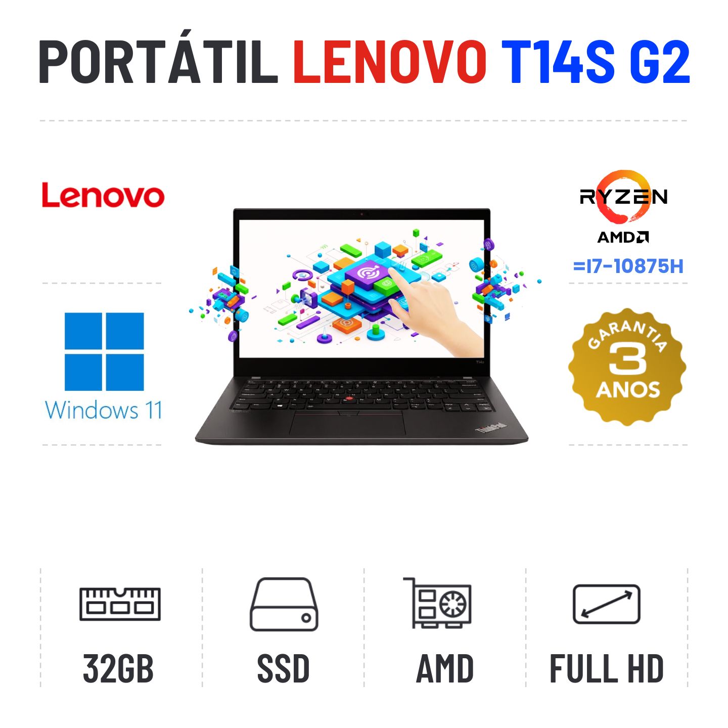 LENOVO THINKPAD T14S G2 | 14" TOUCH FULLHD | RYZEN 7 PRO = I7-10875H | 32GB RAM | 480GB SSD Estado Grau A. Funciona como Novo. Recondicionado sem qualquer tipo de danos. Somente com ligeiros indicios de uso