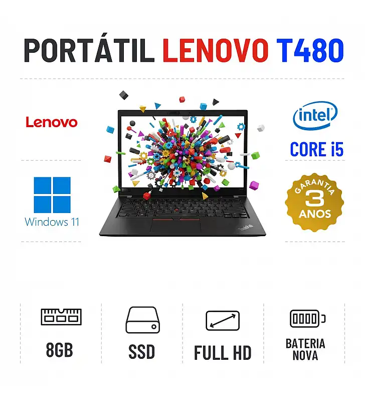 LENOVO THINKPAD T480 | 14.1'' FULLHD | i5-8350U | 8GB RAM | 240GB SSD | BATERIA NOVAEstado Grau A. Funciona como Novo. Recondicionado sem qualquer tipo de danos. Somente com ligeiros indicios de uso