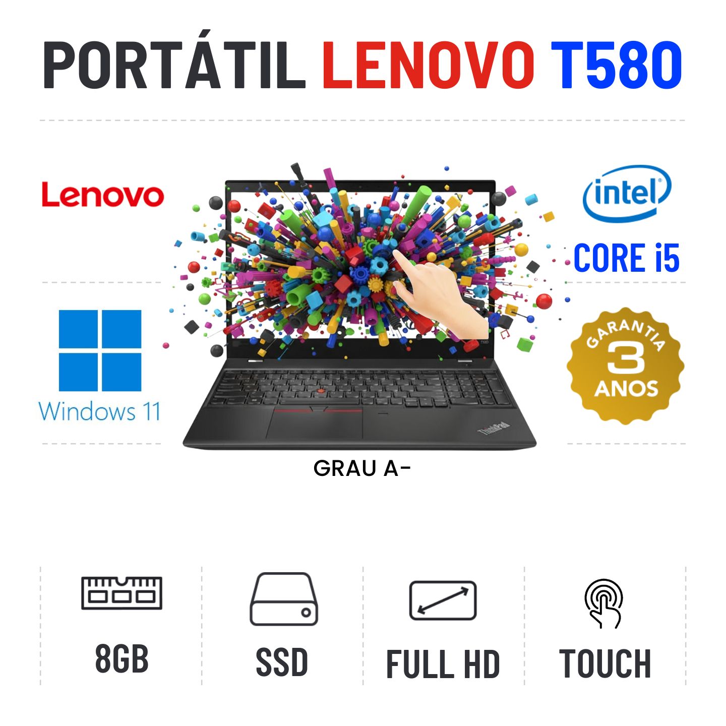 LENOVO THINKPAD T580 | 15.6" TOUCH FULLHD | i5-8350U | 8GB RAM | 240GB SSDGrau A menos - Funciona como Novo. Apontamentos estéticos ligeiros. Preço comparado com novo