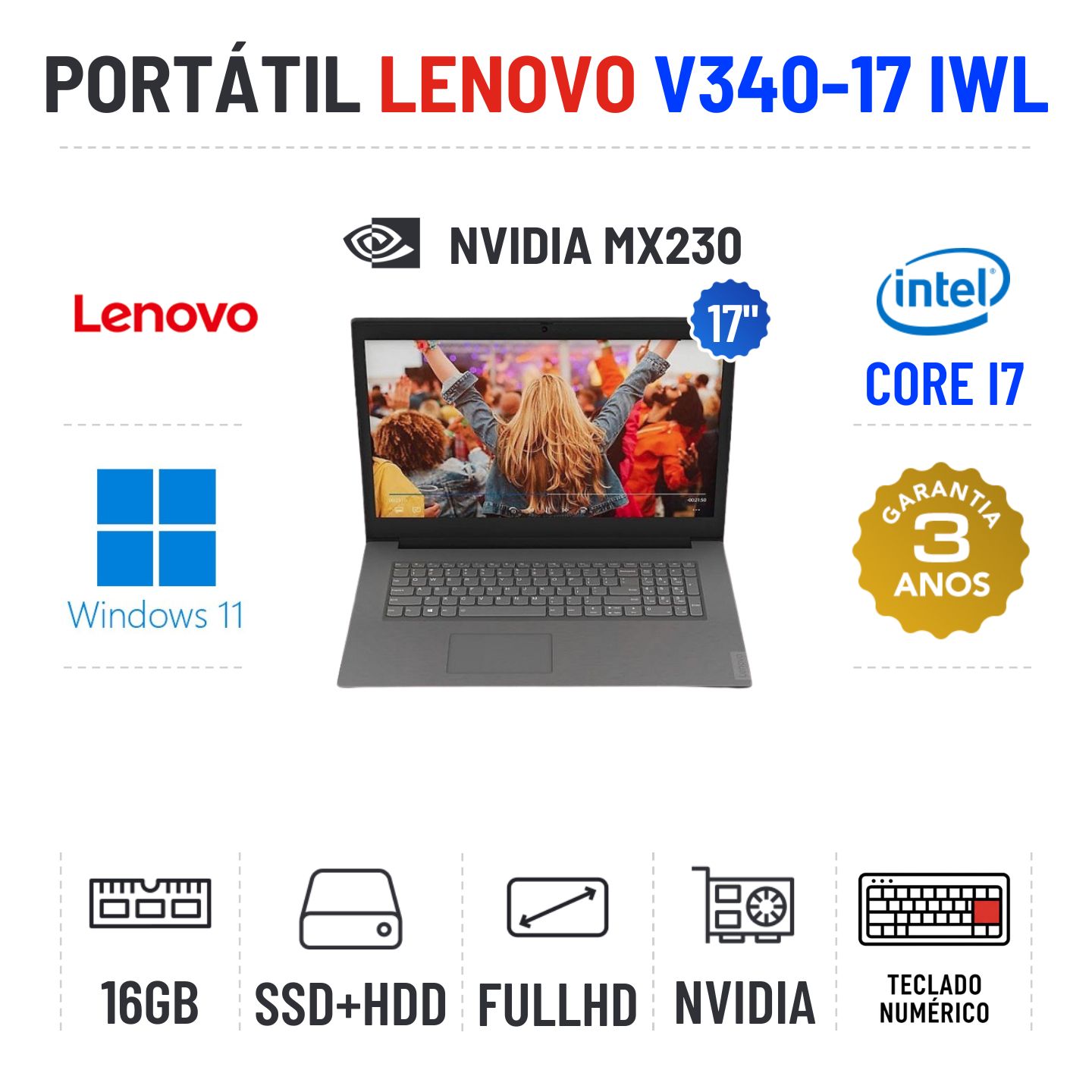 LENOVO V340-17 IWL | 17" FULLHD | i7-8565U | 16GB RAM | SSD+HDD | NVIDIA MX230 | TECLADO NUMÉRICOEstado Grau A. Sem qualquer tipo de danos. Somente com ligeiros indicios de uso