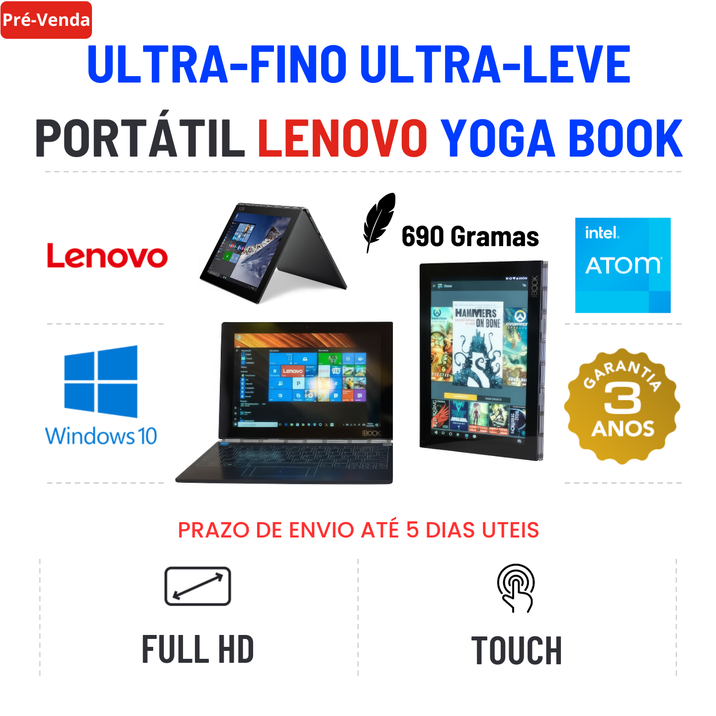 ULTRA FINO - ULTRA LEVE LENOVO YOGA BOOK | 10.1" TOUCH FULLHD | INTEL ATOM X5-Z8550 - SÓ 690 Gramas