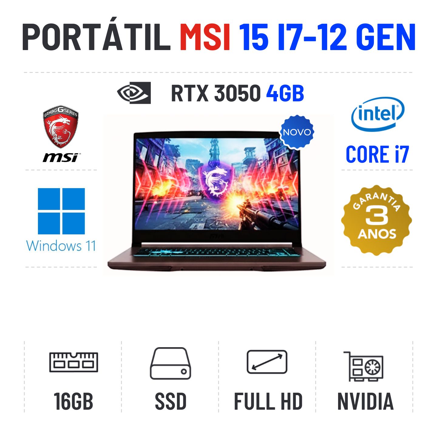 MSI THIN B12UC | 15.6'' FULLHD | i7-12650H | 16GB RAM | 960GB SSD | RTX 3050 4GB Novo com 3 Anos de Garantia