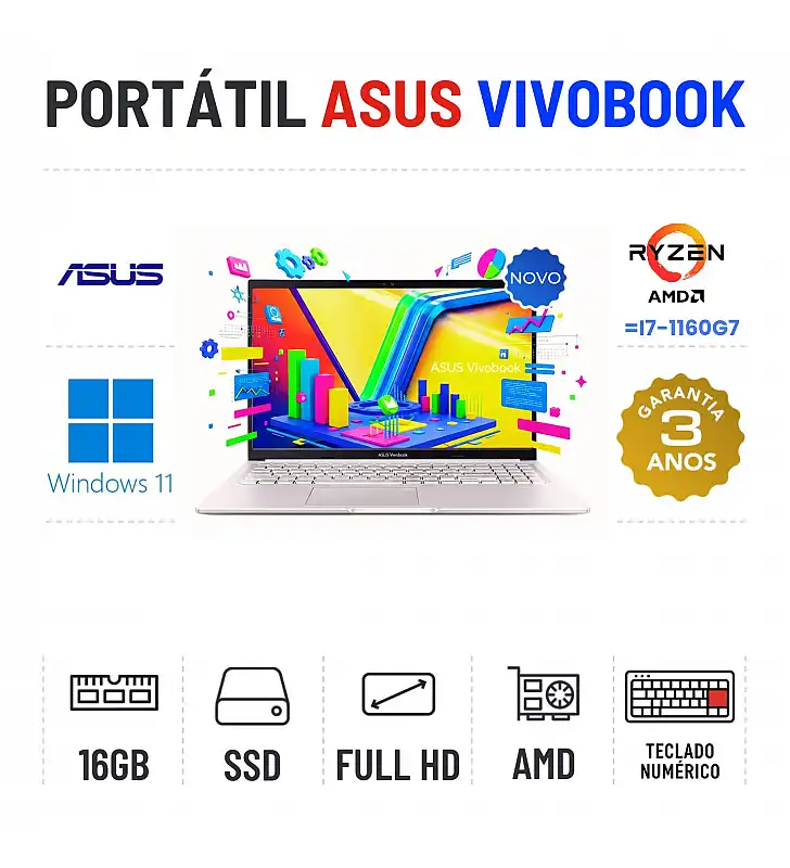 NOVO - ASUS VIVOBOOK 15 E1504FA | 15.6'' FULLHD | RYZEN 5 = i7-1160G7 | 16GB RAM | 480GB SSD | TECLADO NUMÉRICO | OFERTA DE OFFICE 2021Novo com 3 Anos de Garantia