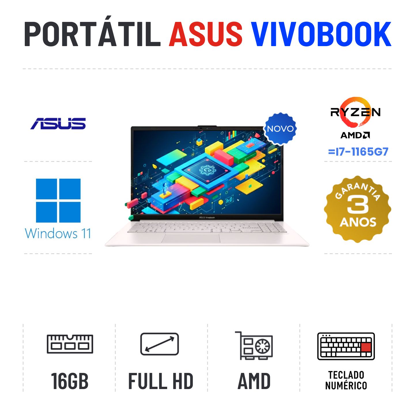NOVO - ASUS VIVOBOOK 15 E1504FA | 15.6'' FULLHD | RYZEN 5 = i7-1165G7 | 16GB RAM | 480GB SSD | TECLADO NUMÉRICONovo com 3 Anos de Garantia