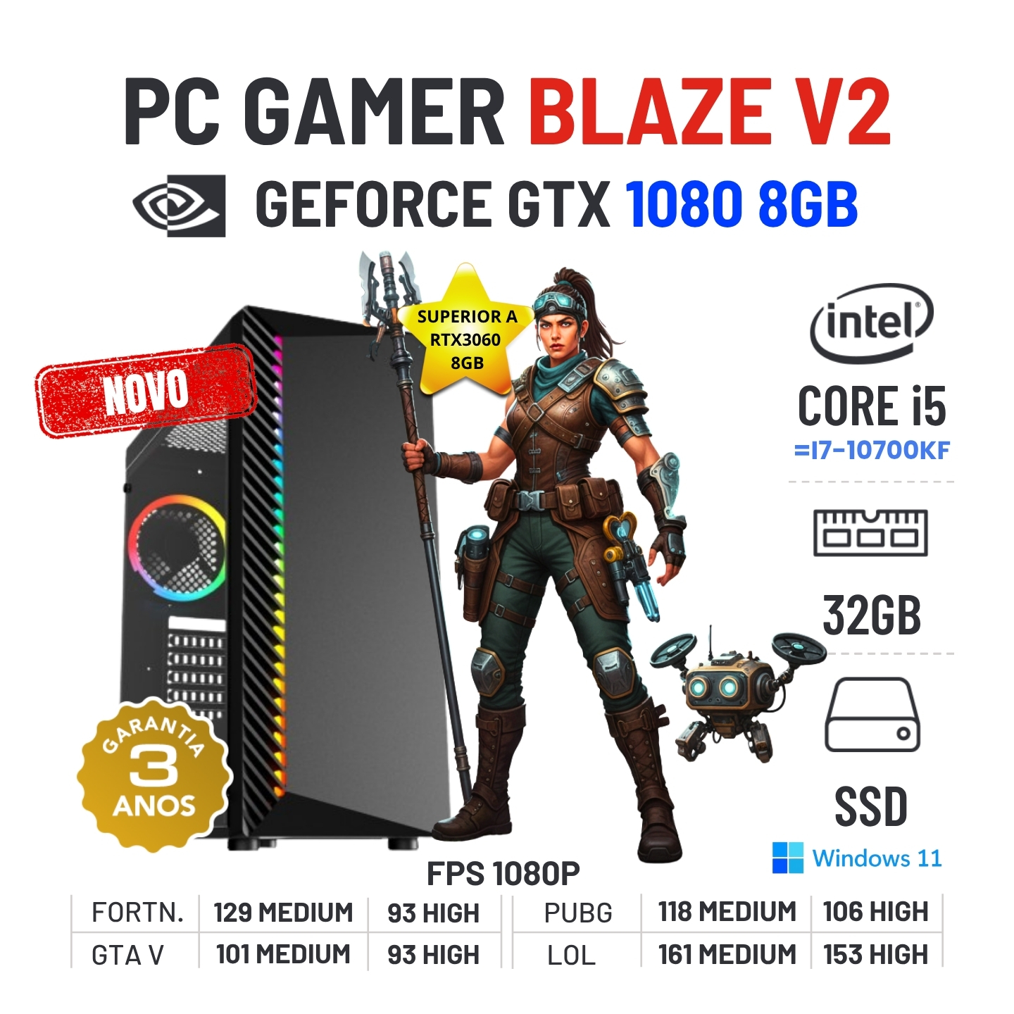 PC GAMER BLAZE V2 NOVO | GTX1080-8GB SUPERIOR A RTX3060-8GB | i5-12GEN=i7-10700KF | 32GB RAM | 480GB SSD OFERTA KIT TECLADO+RATO+TAPETENovo com 3 Anos de Garantia