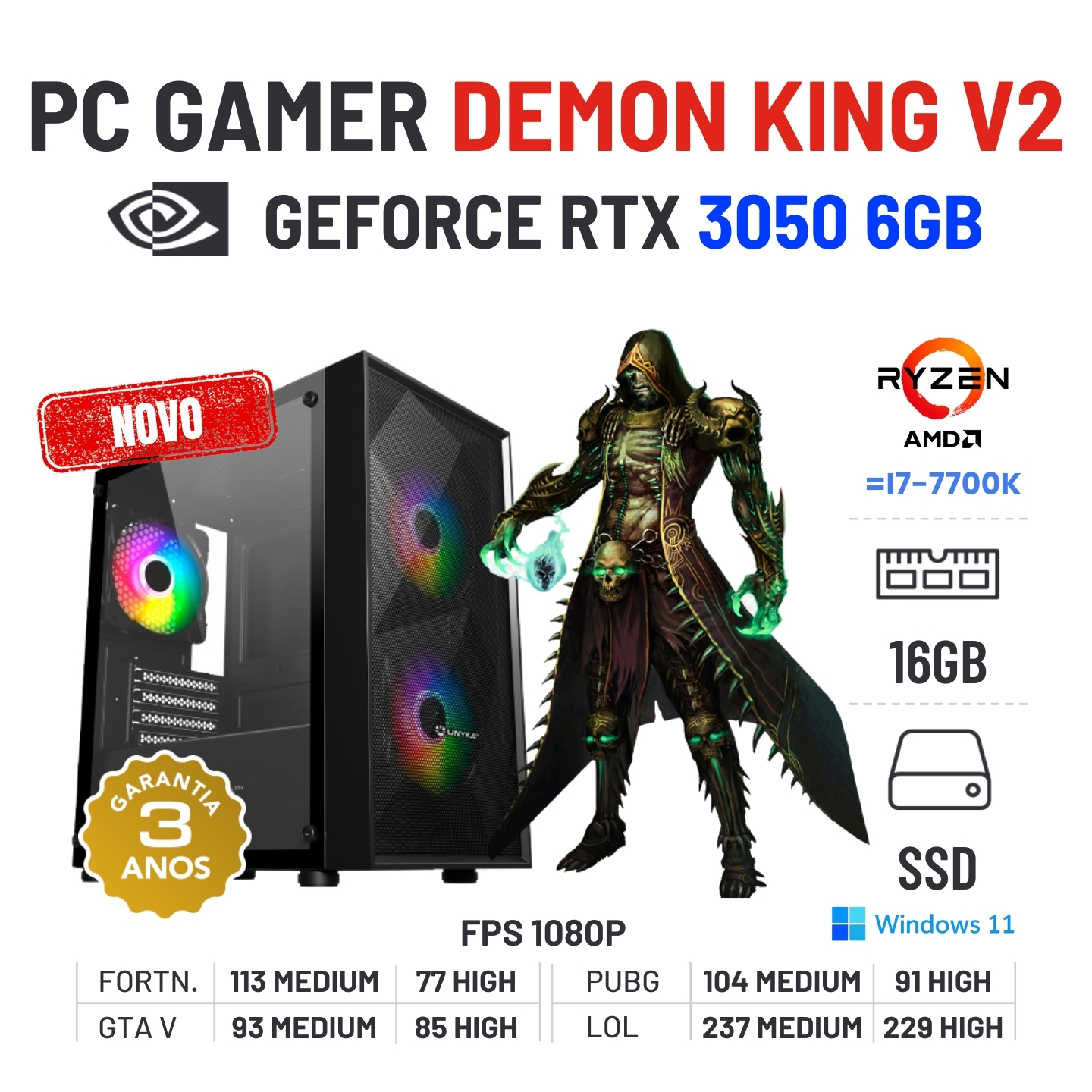 PC GAMER DEMON KING V2 NOVO | RTX3050-6GB | RYZEN 3 = i7-7700K | 16GB RAM | 480GB SSD OFERTA KIT TECLADO+RATO+TAPETENovo com 3 Anos de Garantia