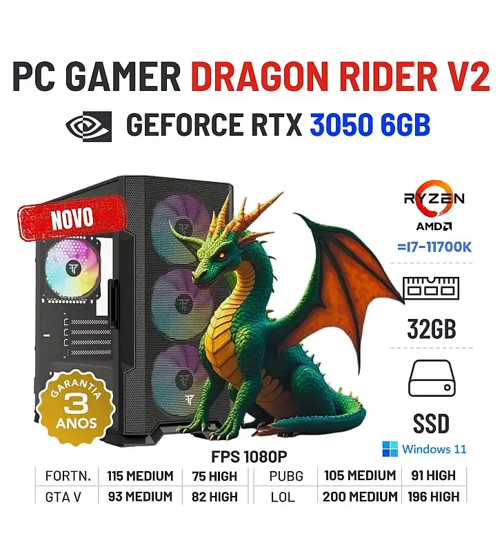 PC GAMER DRAGON RIDER V2 NOVO | RTX3050-6GB | RYZEN 7 = i7-11700K | 32GB RAM | 960GB SSDNovo com 3 Anos de Garantia