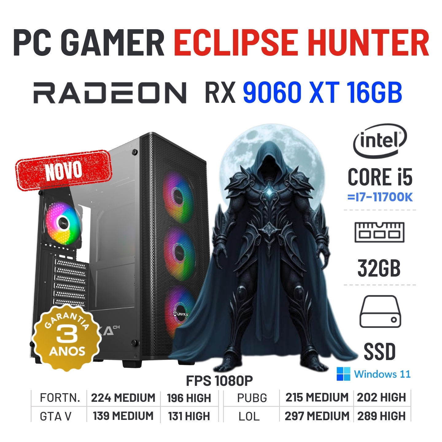 PC GAMER ECLIPSE HUNTER NOVO | RX9060XT-16GB | i5-14GEN=i7-11700K | 32GB RAM | 960GB SSD OFERTA KIT TECLADO+RATO+TAPETE