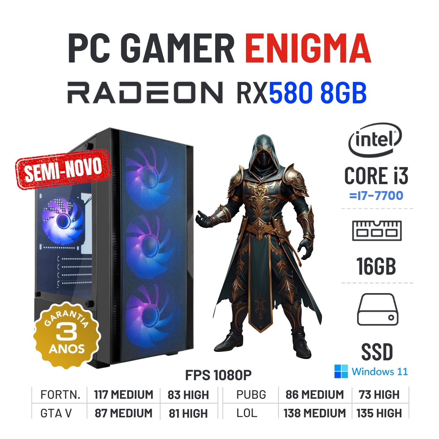 PC GAMER ENIGMA SEMI-NOVO | RX580-8GB | i3-10GEN=I7-7700 | 16GB RAM | 480GB SSDSemiNovo - Em estado fisico Como Novo. Poderá ter um componente recondicionado. 3 anos de garantia