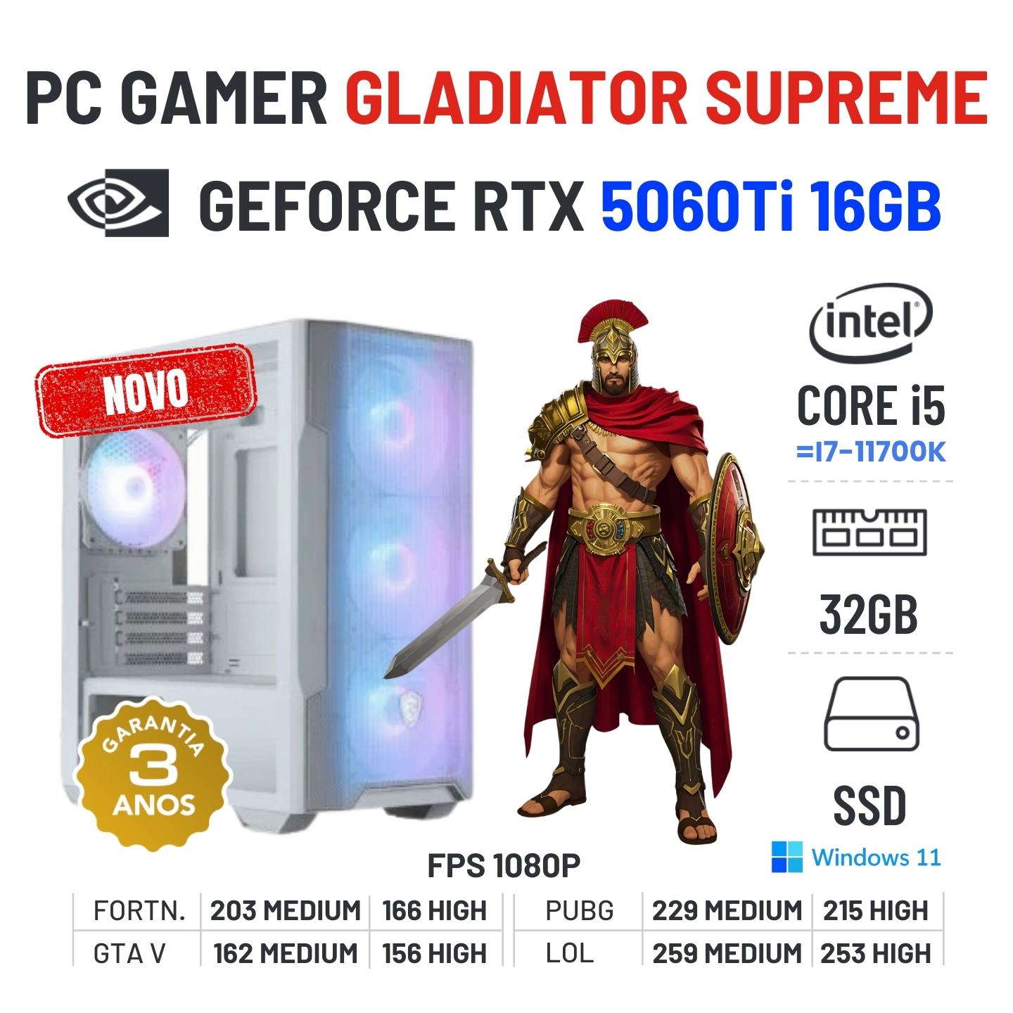 PC GAMER GLADIATOR SUPREME NOVO | RTX5060Ti-16GB | i5-14GEN=i7-11700K | 32GB RAM | 960GB SSD OFERTA KIT TECLADO+RATO+TAPETE