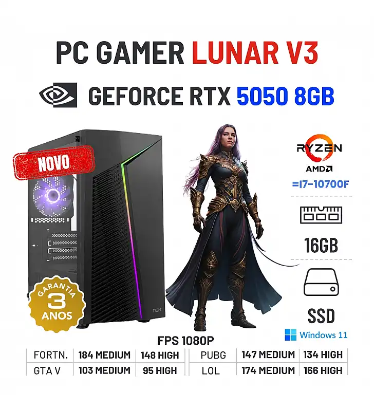 PC GAMER LUNAR V3 NOVO | RTX5050-8GB | RYZEN 5 = i7-10700F | 16GB RAM | 960GB SSDNovo com 3 Anos de Garantia