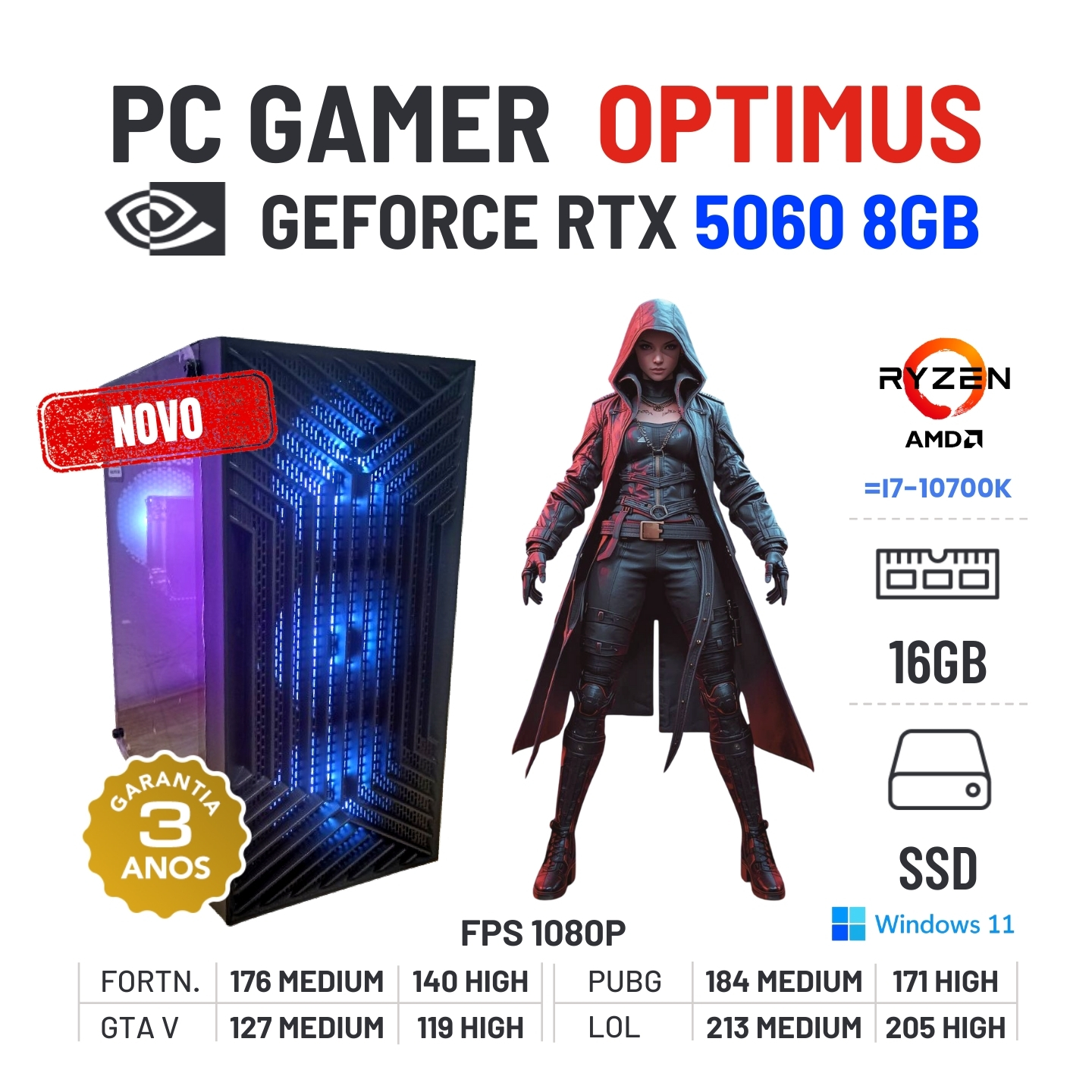 PC GAMER OPTIMUS NOVO | RTX5060-8GB | RYZEN 5 = i7-10700K | 16GB RAM | 960GB SSD OFERTA KIT TECLADO+RATO+TAPETENovo com 3 Anos de Garantia