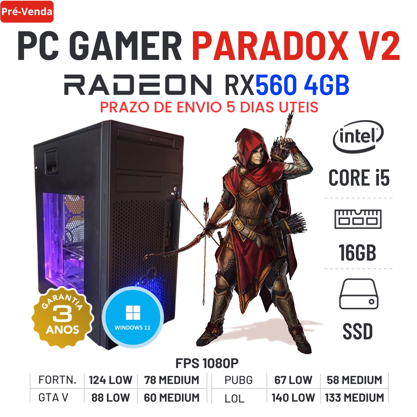 PC GAMER PARADOX V2 | RX560-4GB | I5-8500 | 16GB RAM | 240GB SSDEstado Grau A. Sem qualquer tipo de danos. Somente com ligeiros indicios de uso