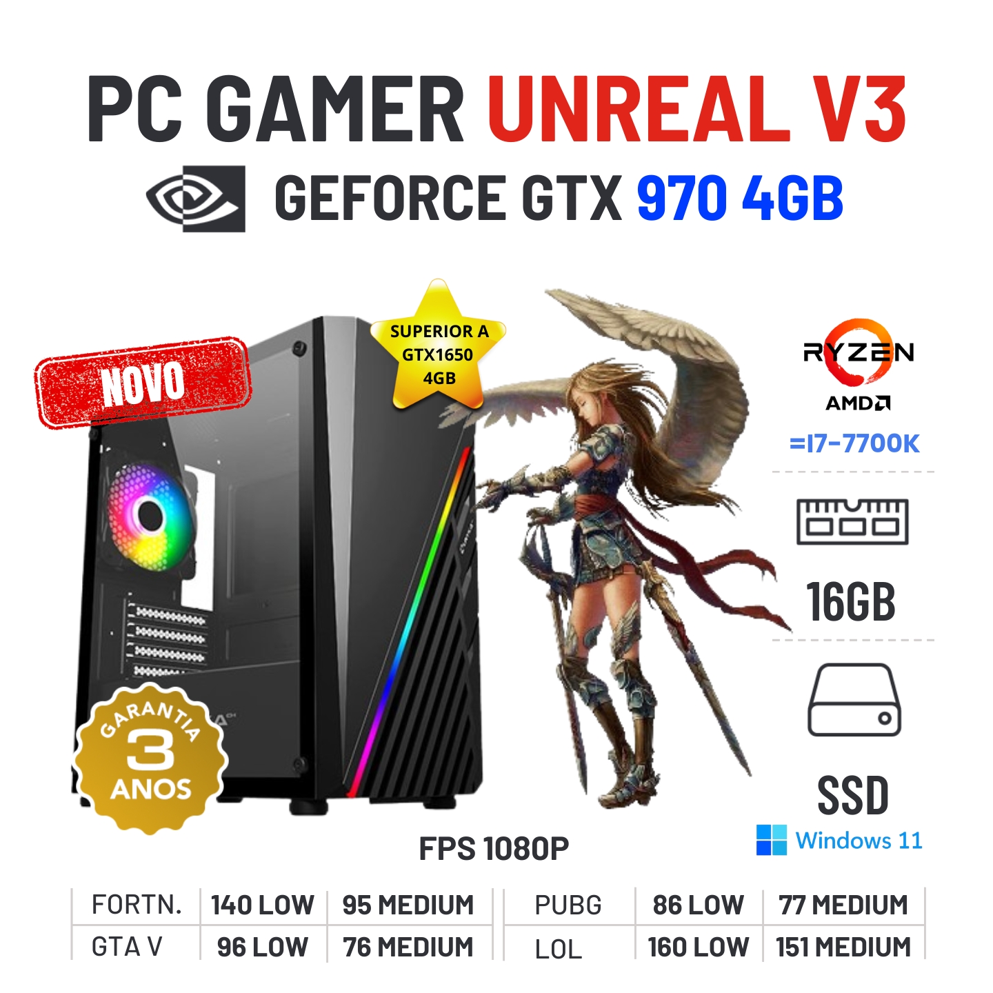 PC GAMER UNREAL V3 NOVO | GTX970-4GB SUPERIOR A GTX1650-4GB | RYZEN 3 = i7-7700K | 16GB RAM | 240GB SSD OFERTA KIT TECLADO+RATO+TAPETENovo com 3 Anos de Garantia