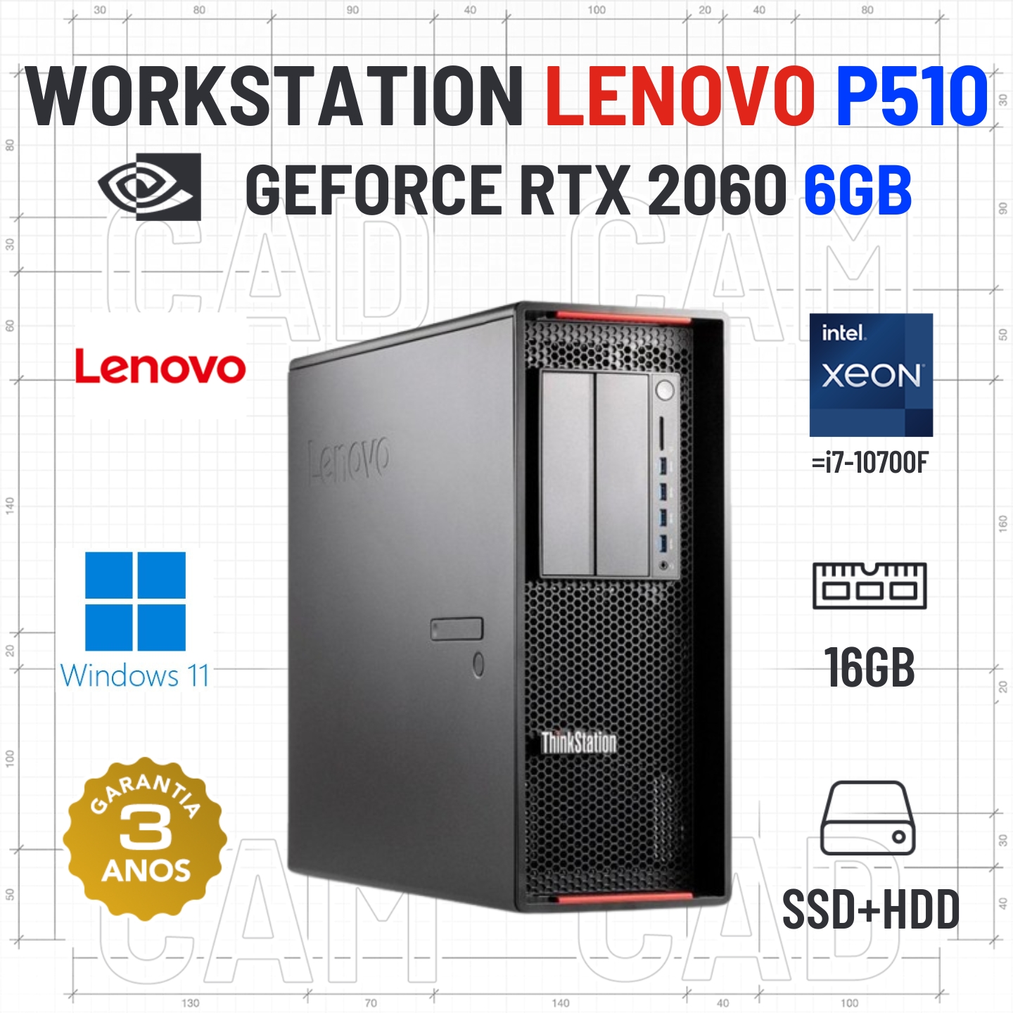 WORKSTATION LENOVO P510 | XEON=i7-10700F | 16GB RAM | SSD + HDD | RTX2060-6GB | OFERTA DE OFFICE 2021Estado Grau A. Funciona como Novo. Recondicionado sem qualquer tipo de danos. Somente com ligeiros indicios de uso