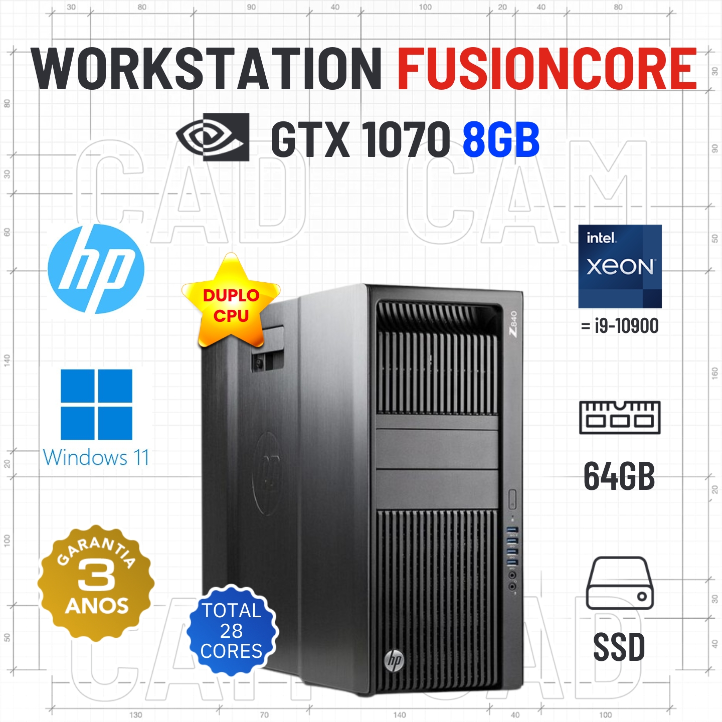 WORKSTATION FUSIONCORE HP Z840 | DUPLO XEON 28 CORES = i9-10900 | 64GB RAM | 960GB SSD | GTX1070-8GB | OFERTA DE OFFICE 2021