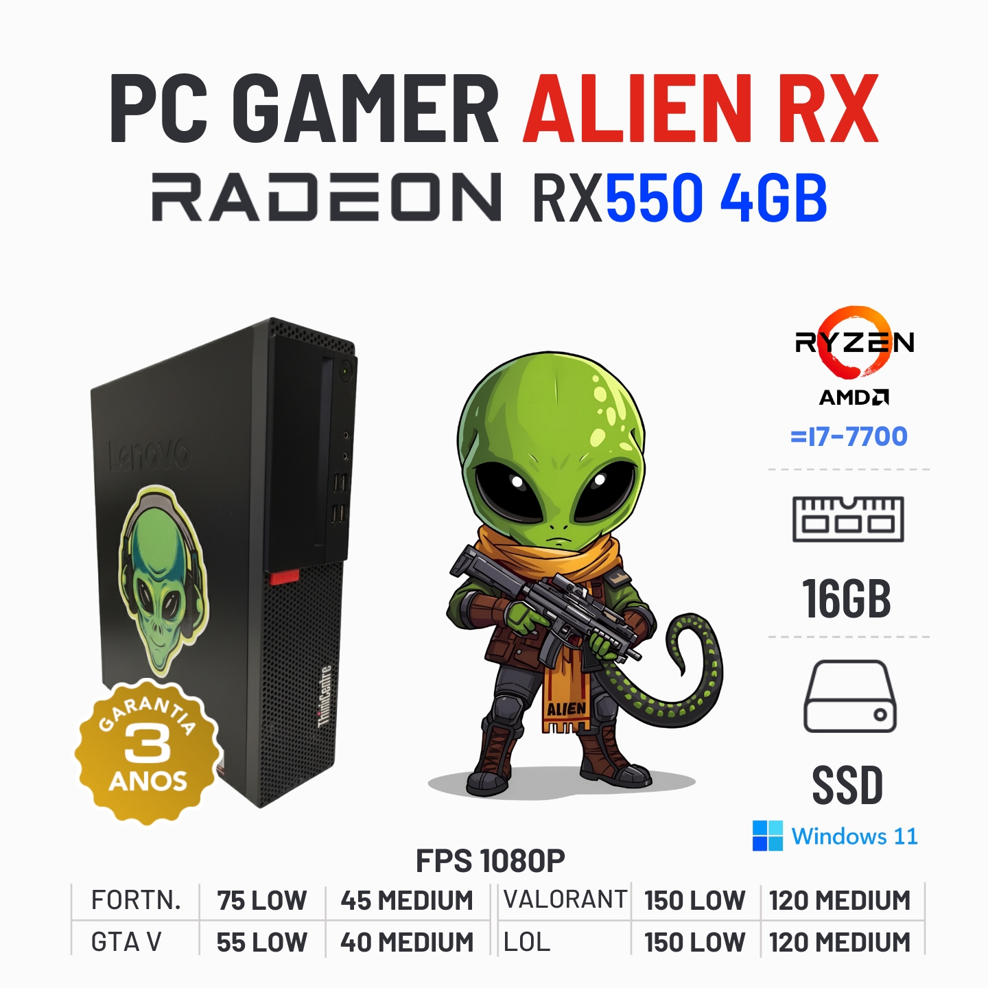 PC GAMER ALIEN RX | RX550-4GB | RYZEN 5 PRO=I7-7700 | 16GB RAM | 240GB SSDEstado Grau A. Sem qualquer tipo de danos. Somente com ligeiros indicios de uso