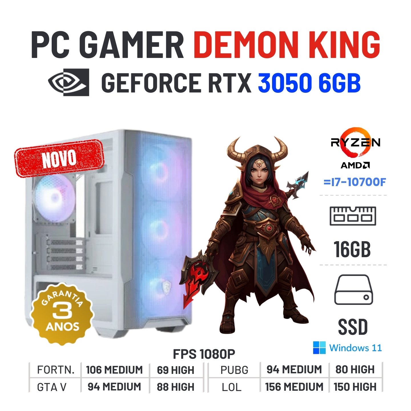 PC GAMER DEMON KING NOVO | RTX3050-6GB | RYZEN 5 = i7-10700F | 16GB RAM | 480GB SSD