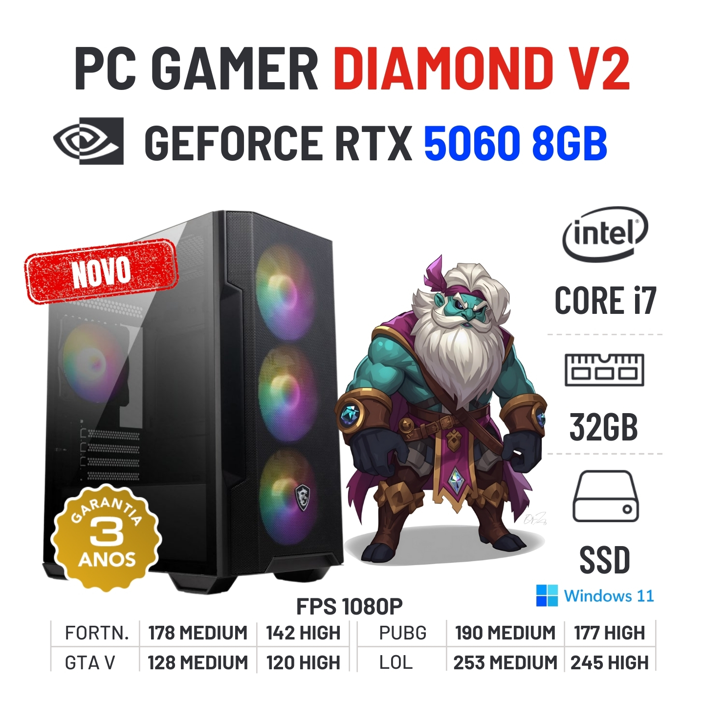 PC GAMER DIAMOND V2 NOVO | RTX5060-8GB | i7-12700KF | 32GB RAM | 960GB SSDNovo com 3 Anos de Garantia