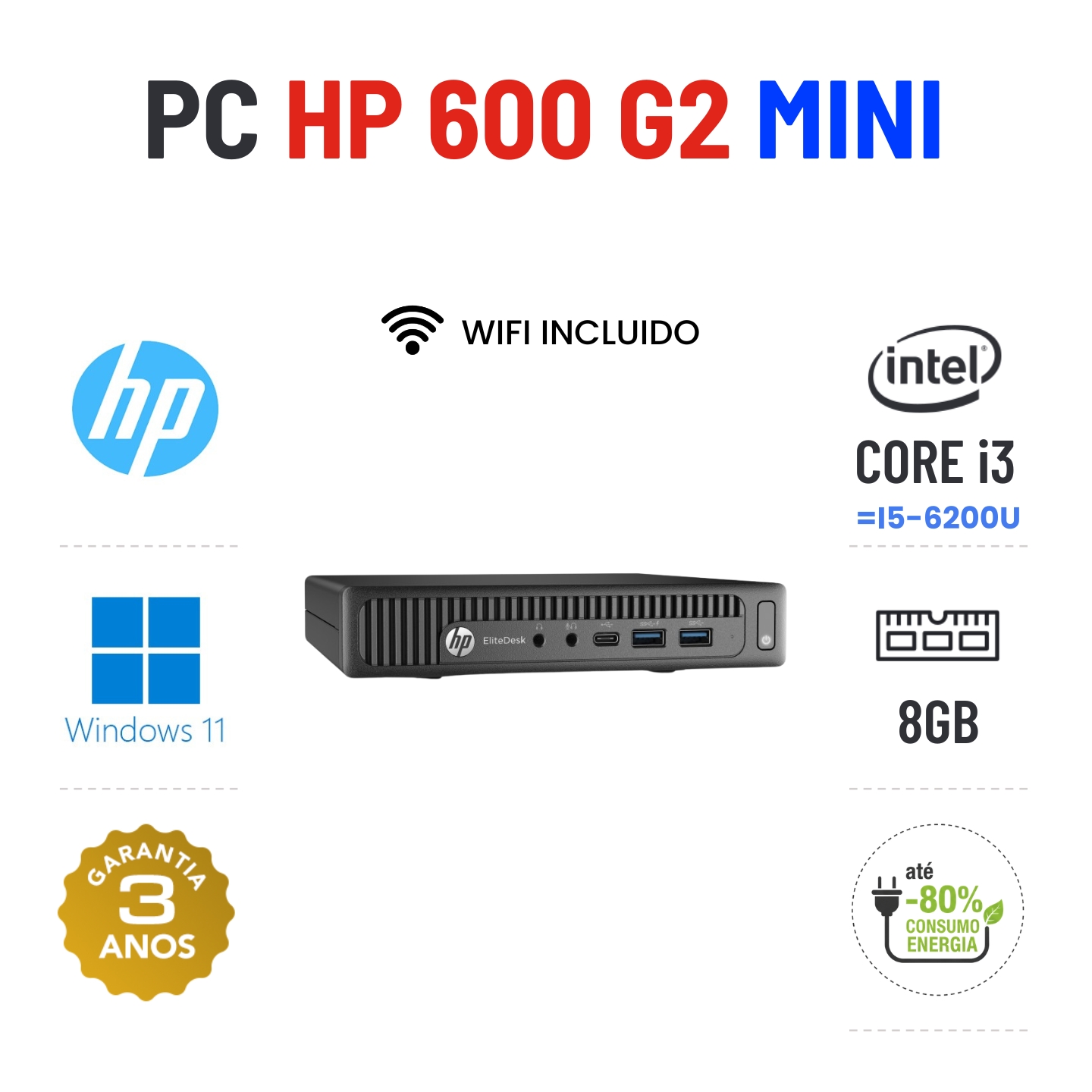HP ELITEDESK 600 G2 MINI | i3 = i5-6200U | 8GB RAM | 240GB SSD | OFERTA DE OFFICE 2021Estado Grau A. Funciona como Novo. Recondicionado sem qualquer tipo de danos. Somente com ligeiros indicios de uso