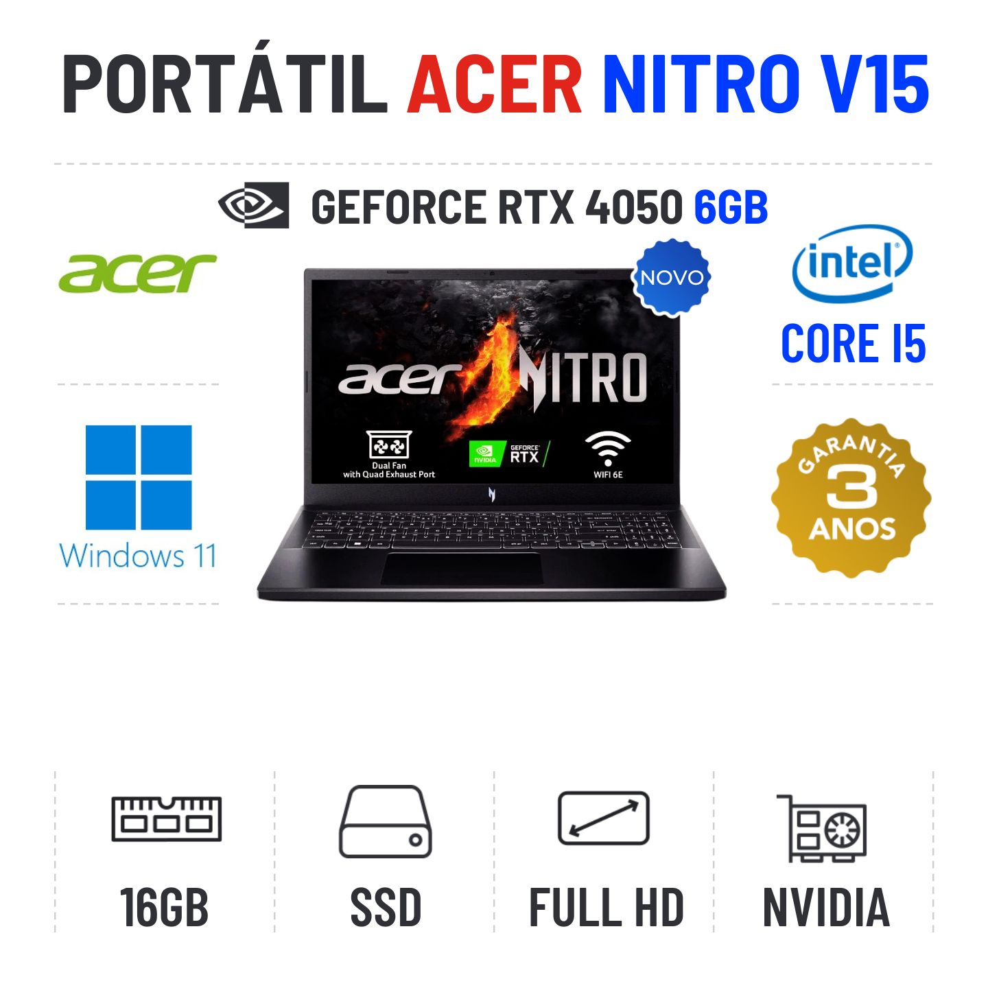ACER NITRO V15 | 15.6'' FULLHD 144Hz | I5-13420H | 16GB RAM | 480GB SSD | RTX4050 6GBNovo com 3 Anos de Garantia
