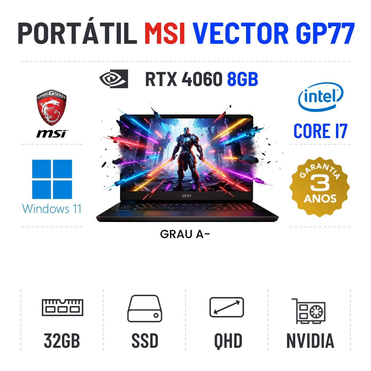 MSI VECTOR GP77 , um portátil gaming com processador Intel Core I7 de 13º geração, 32 GB de RAM, 960 GB de disco rígido SSD e placa gráfica RTX 4060 com 8GB.