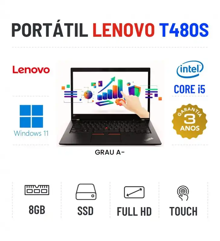 LENOVO THINKPAD T480s | 14.1'' TOUCH FULLHD | i5-8250u | 8GB RAM | 240GB SSDGrau A menos - Funciona como Novo. Apontamentos estéticos ligeiros. Preço comparado com novo