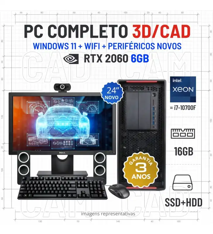 CONJUNTO 3D/CAD LENOVO P510 | XEON=i7-10700F | 16GB RAM | SSD + HDD | RTX2060-6GB COM MONITOR + ACESSORIOS